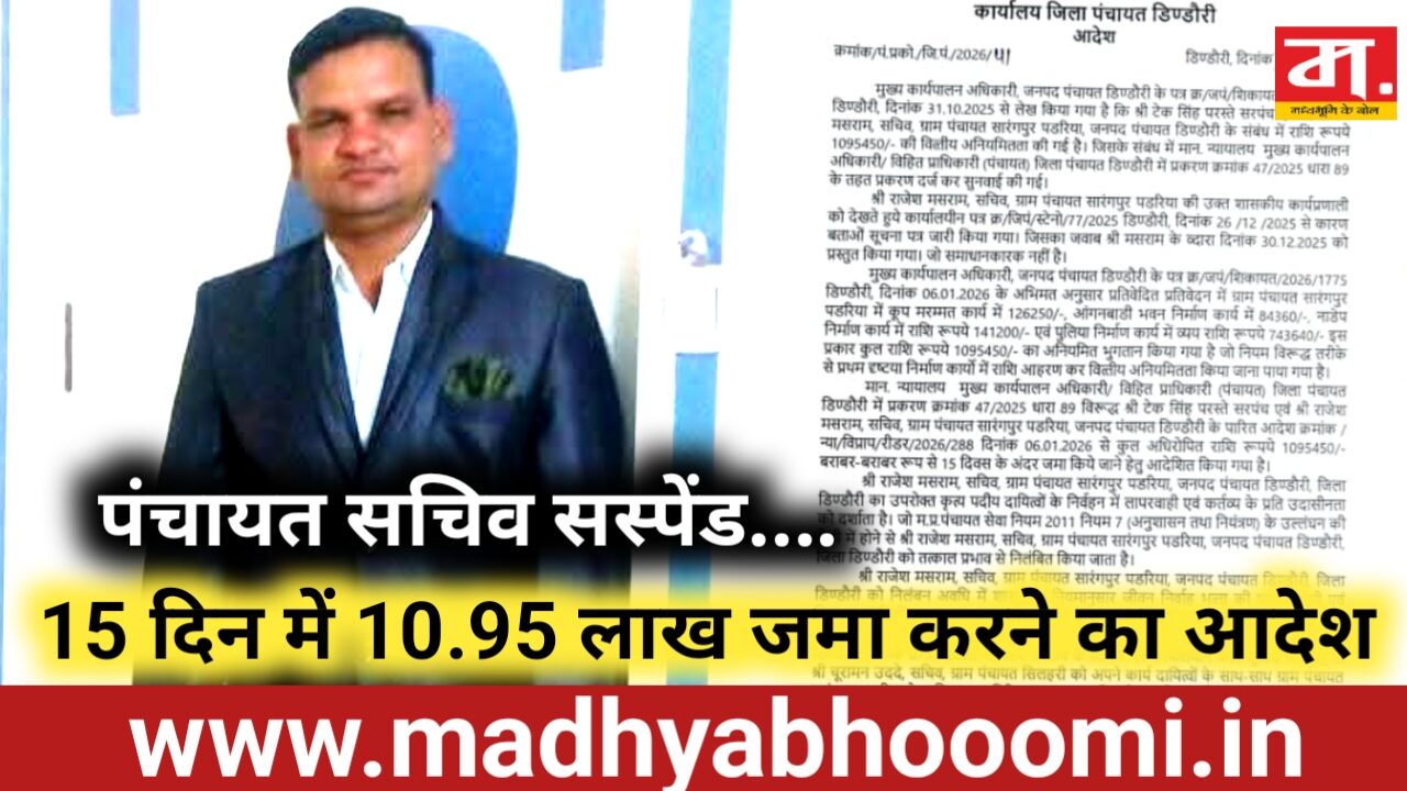 सारंगपुर पड़रिया सचिव राजेश मसराम को जिला सीईओ ने किया सस्पेंड! 15 दिन में 10.95 लाख जमा करने का आदेश