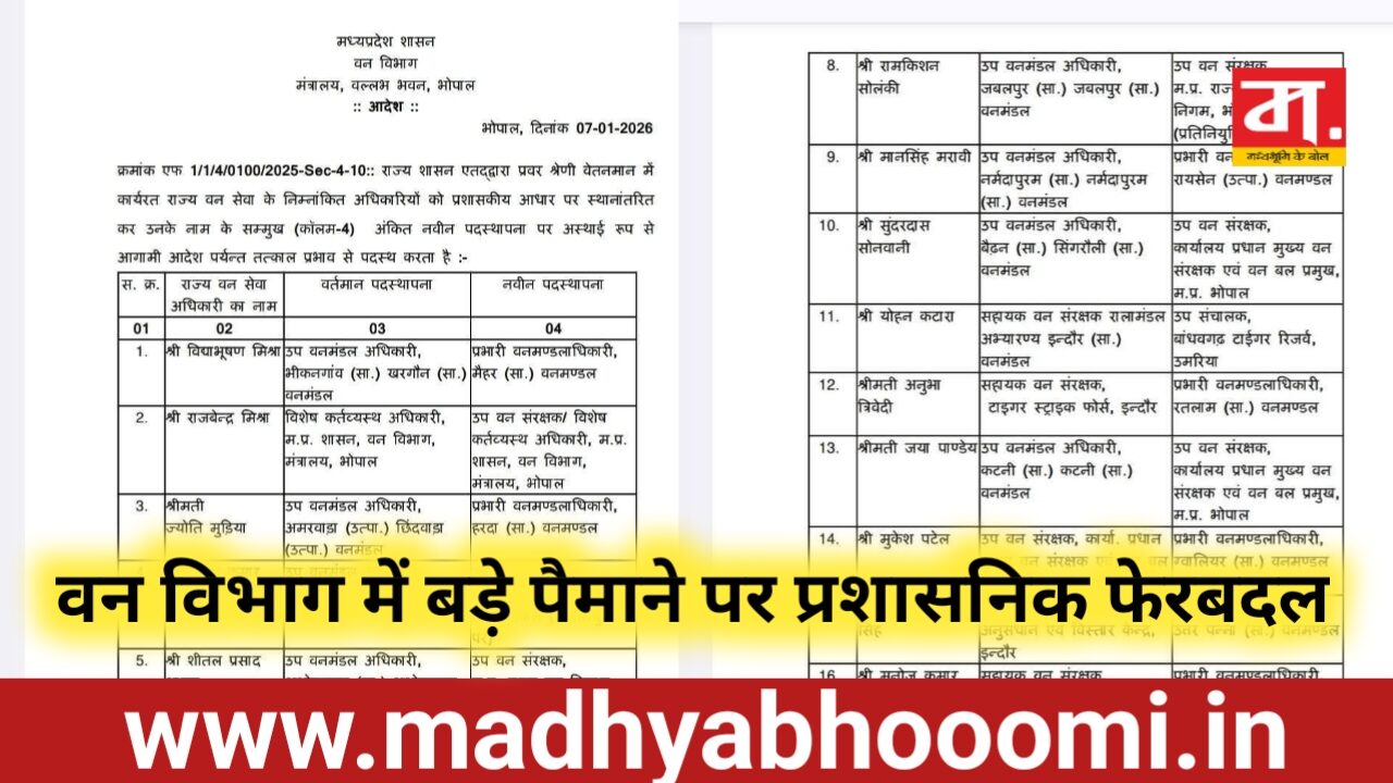 MP News: मध्यप्रदेश वन विभाग में बड़े पैमाने पर प्रशासनिक फेरबदल,20 वन अधिकारियों की नवीन पदस्थापना आदेश जारी