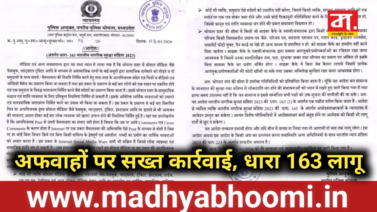 MP News: सोशल मीडिया पर भड़काऊ पोस्ट व अफवाहों पर सख्त कार्रवाई, भोपाल में धारा 163 लागू