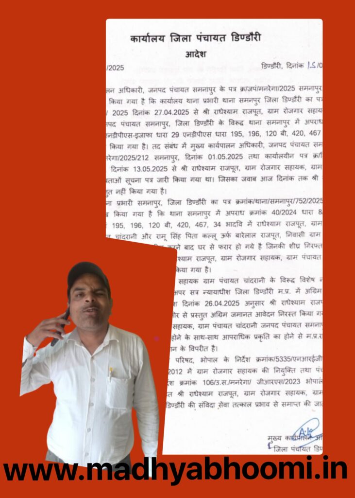 डिंडौरी न्यूज। मुख्य कार्यपालन अधिकारी, जनपद पंचायत समनापुर के पत्र क्रमांक/मनरेगा/2025 समनापुर, दिनांक 13.05.2025 से लेख किया गया है कि कार्यालय थाना प्रभारी थाना समनापुर जिला डिण्डोरी के पत्र क्रमांक थाना समनापुर/611/2025 दिनांक 27.04.2025 से राधेश्याम राजपूत, ग्राम रोजगार सहायक, ग्राम पंचायत चांदरानी जनपद पंचायत समनापुर, जिला डिण्डोरी के विरुद्ध थाना समनापुर में अपराध क्रमांक 420/24 धारा-8/20 एनडीपीएस-इत्यादि एवं 29 एनडीपीएस धारा 195, 196, 120 बी, 420, 467 आदि के तहत मामला पंजीबद्ध किया गया है। तत्संबंध में मुख्य कार्यपालन अधिकारी, जनपद पंचायत समनापुर द्वारा पत्र क्रमांक/मनरेगा/2025/212 समनापुर, दिनांक 01.05.2025 से राधेश्याम राजपूत के विरुद्ध प्रकरण क्रमांक 4688/2025 दिनांक 13.05.2025 से राधेश्याम राजपूत, ग्राम रोजगार सहायक को कारण बताओ सूचना पत्र जारी किया गया था। जिसका जवाब आज दिनांक तक द्वारा प्रस्तुत नहीं किया गया है।