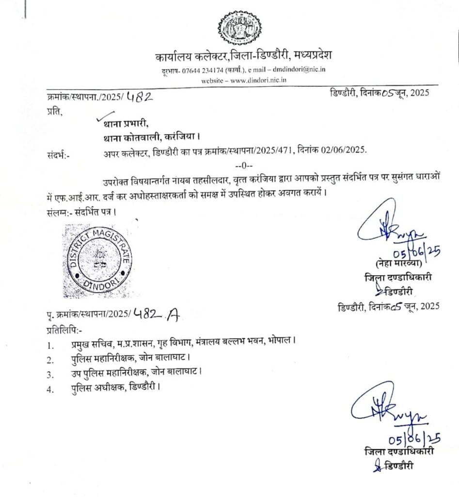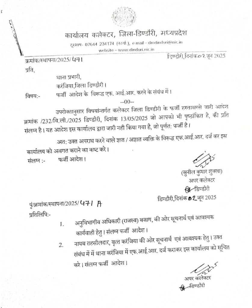 कलेक्टर डिंडौरी के फर्जी लेटर हेड पर जारी आदेश में उल्लेख है कि,,