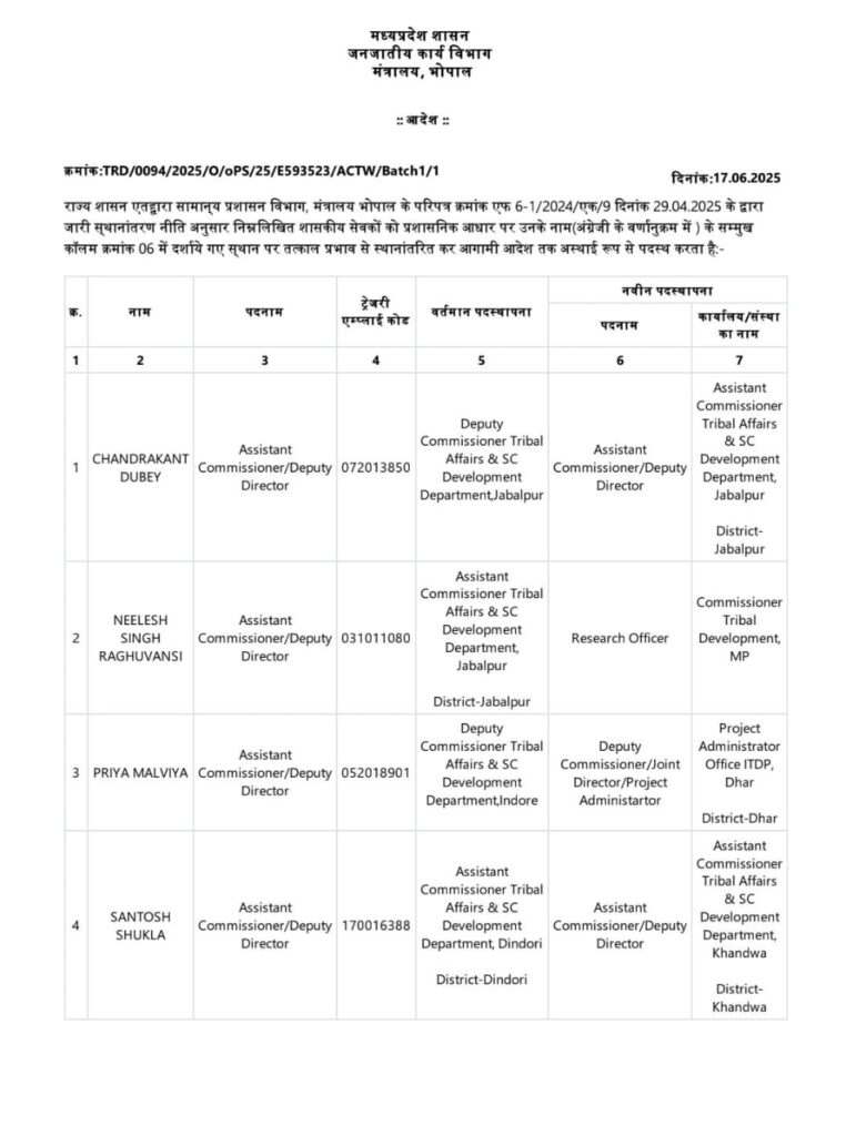 प्राप्त जानकारी के अनुसार मध्यप्रदेश शासन जनजातीय कार्य विभाग मंत्रालय भोपाल द्वारा 17 जून को आदेश जारी कर सहायक आयुक्त संतोष शुक्ला को डिंडौरी से हटाकर खंडवा में पदस्थ किया गया है।