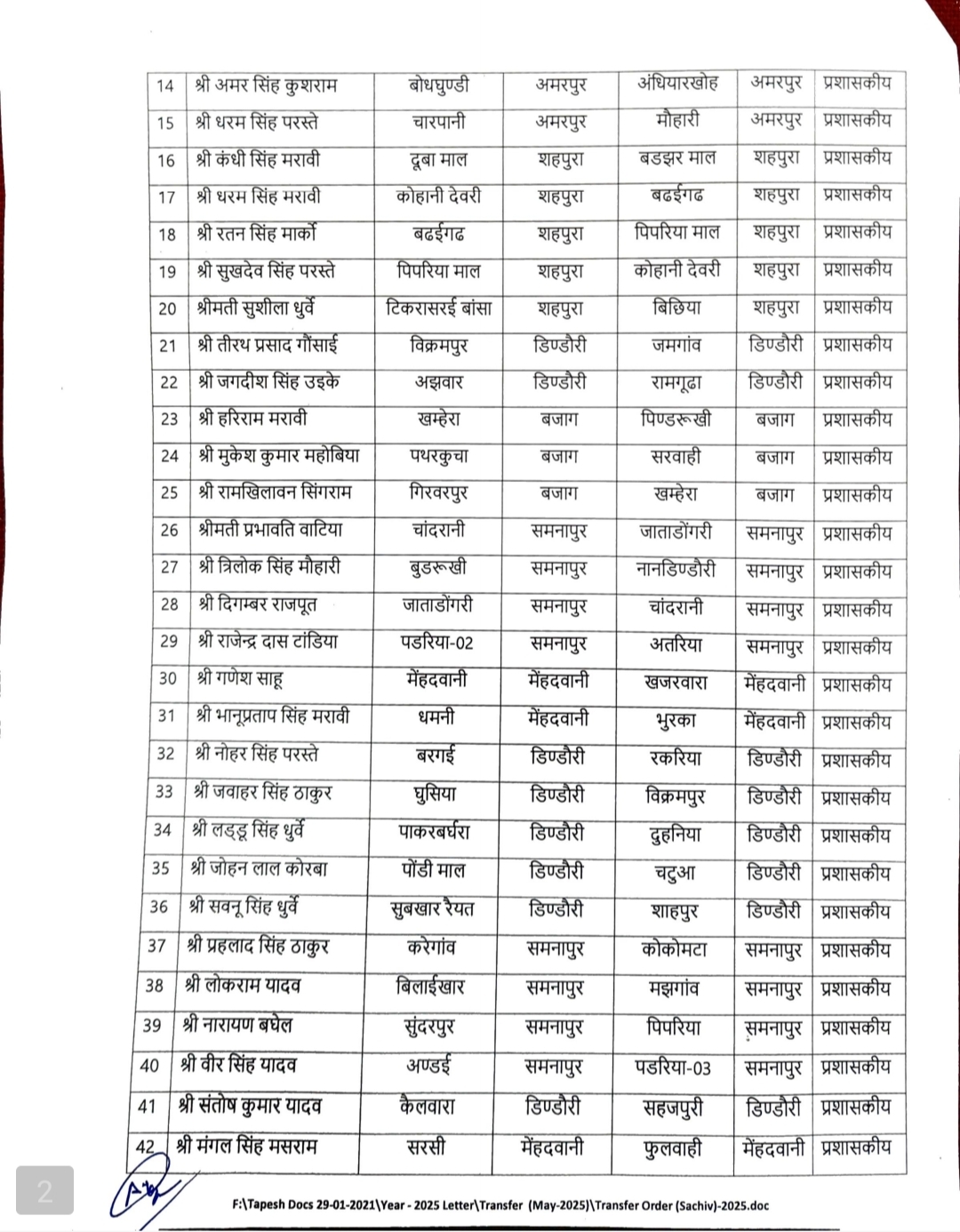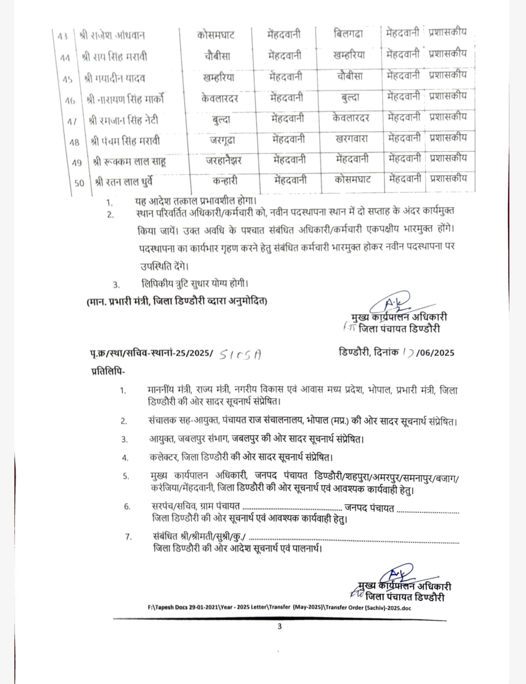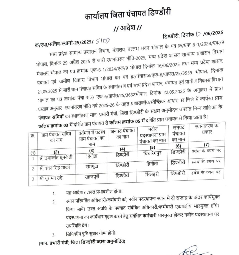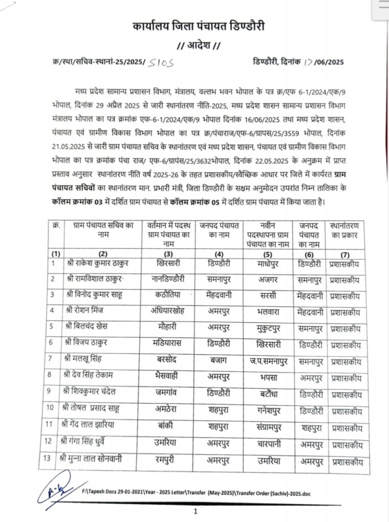 डिंडौरी न्यूज । जिला पंचायत डिंडौरी के अंतर्गत कार्यरत पंचायत सचिवों के स्थानांतरण को लेकर प्रशासन ने बड़ा निर्णय लिया है। मध्यप्रदेश शासन की स्थानांतरण नीति-2025 के अंतर्गत जिले के 53 पंचायत सचिवों के तबादले के आदेश जारी कर दिए गए हैं।