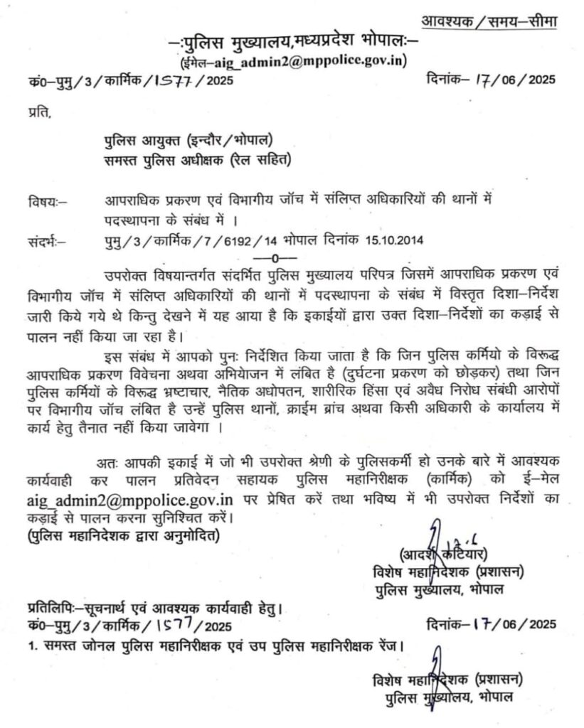 भोपाल न्यूज। पुलिस मुख्यालय, मध्यप्रदेश द्वारा प्रदेशभर के पुलिस अधिकारियों (SP – ADGP) को सख्त निर्देश जारी किए गए हैं कि आपराधिक प्रकरणों एवं विभागीय जाँच में लिप्त पुलिस अधिकारियों/कर्मचारियों को थानों में पदस्थ न किया जाए। पुलिस महानिदेशक के अनुमोदन से जारी आदेश में कहा गया है कि पूर्व में भी इस आशय के दिशा-निर्देश जारी किए गए थे, जिनका पालन अब तक नहीं हो पाया है।