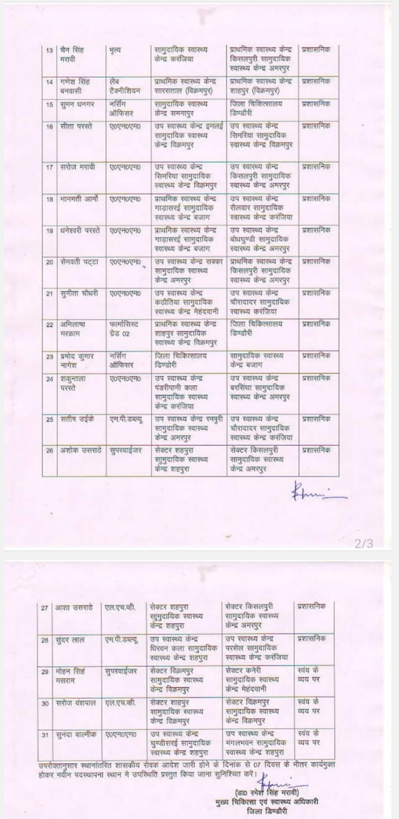 जारी आदेश के अनुसार जिले के विभिन्न सामुदायिक स्वास्थ्य केंद्रों, प्राथमिक स्वास्थ्य केंद्रों और जिला चिकित्सालय में कार्यरत कुल 31 स्वास्थ्य कर्मियों को नवीन पदस्थापना दी गई है। इनमें चिकित्सा अधिकारी, स्टाफ नर्स, लैब टेक्नीशियन एवं अन्य स्टाफ शामिल हैं।