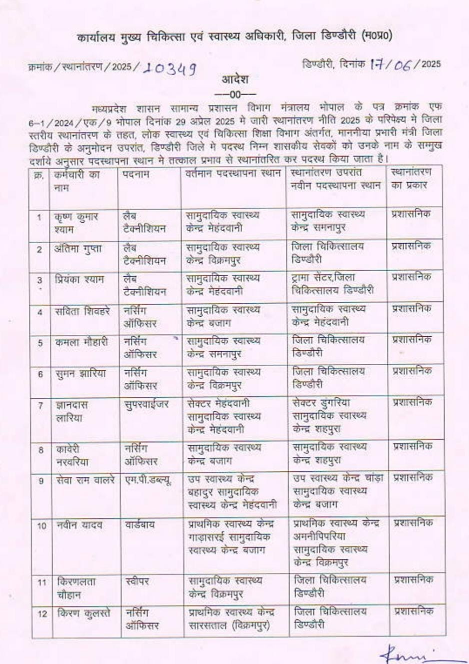 डिंडौरी न्यूज। जिले स्वास्थ्य सेवाओं को सुचारु एवं प्रभावी बनाने के उद्देश्य से जिला मुख्य चिकित्सा एवं स्वास्थ्य अधिकारी कार्यालय द्वारा स्वास्थ्य कर्मियों के तबादले के आदेश जारी किए गए हैं। यह आदेश मध्यप्रदेश शासन सामान्य प्रशासन विभाग मंत्रालय भोपाल के निर्देशों के अनुरूप जारी किया गया है।