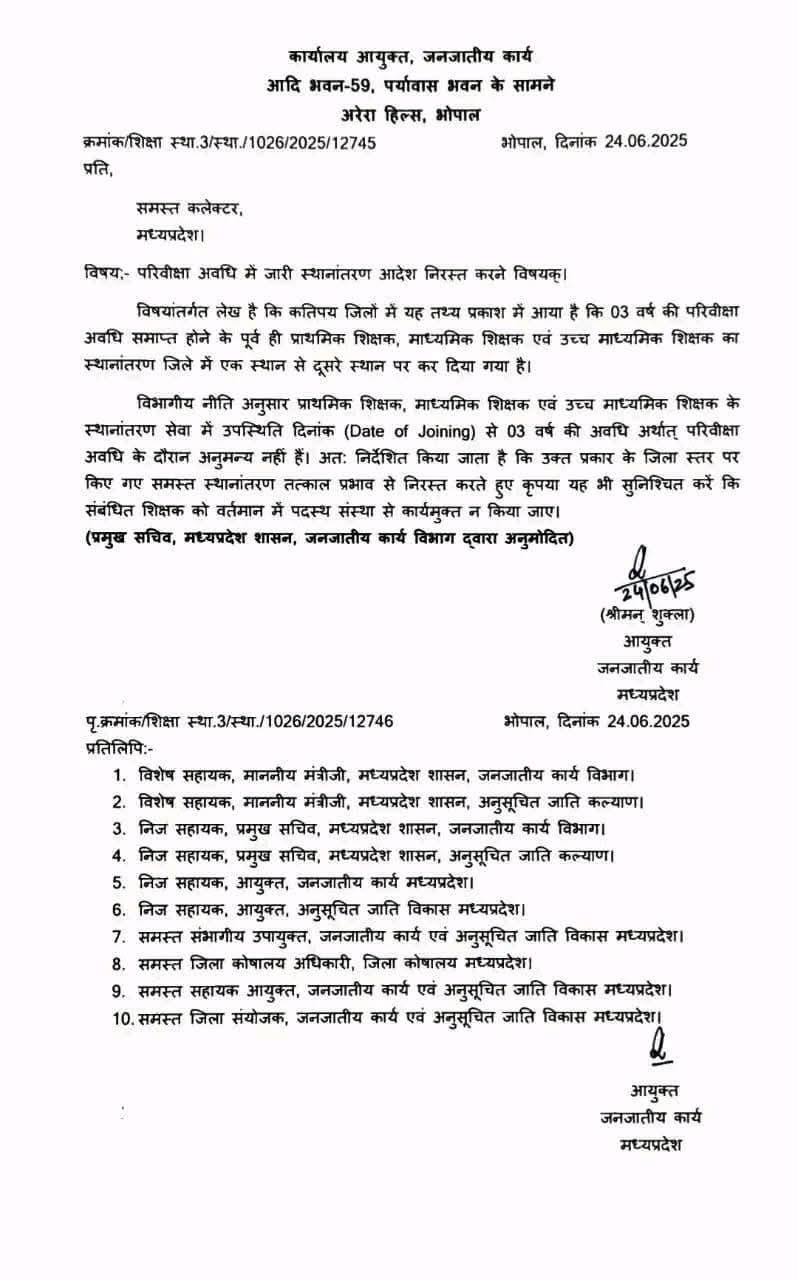 भोपाल न्यूज़ । जनजातीय कार्य विभाग, मध्यप्रदेश शासन ने एक महत्वपूर्ण निर्णय लेते हुए उन प्राथमिक, माध्यमिक एवं उच्च माध्यमिक शिक्षकों के स्थानांतरण आदेश निरस्त कर दिए हैं जिन्होंने अपनी नियुक्ति की तिथि (Date of Joining) से 3 वर्ष की परीक्षा अवधि पूर्ण नहीं की है। यह निर्णय विभागीय नीति के तहत लिया गया है, जिसमें स्पष्ट प्रावधान है कि परीक्षा अवधि पूर्ण होने से पूर्व किसी भी शिक्षक का स्थानांतरण अनुमन्य नहीं है।