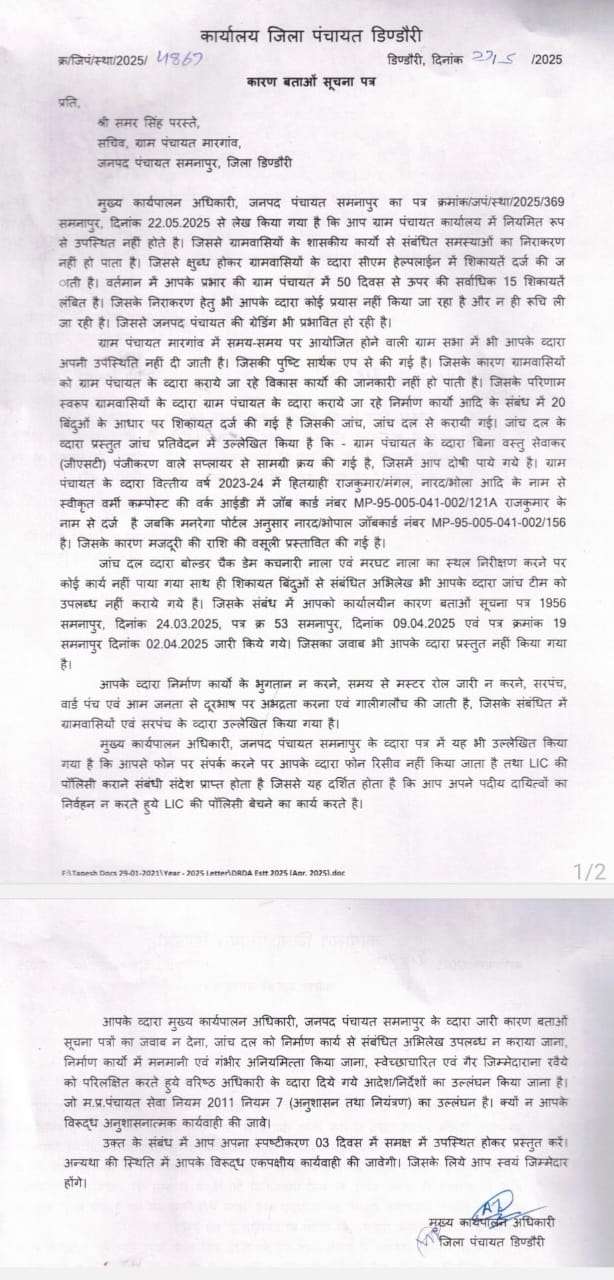 डिंडौरी न्यूज । समनापुर जनपद अंतर्गत ग्राम पंचायत मारगांव में पदस्थ सचिव समर सिंह परस्ते एक बार फिर विवादों में घिर गए हैं। ग्रामीणों ने सचिव पर वित्तीय अनियमितता, भ्रष्टाचार, शासकीय कार्यों में लापरवाही और आम जनता से अभद्रता करने जैसे गंभीर आरोप लगाते हुए जिला प्रशासन से शिकायत की थी। ग्रामीणों ने 20 बिंदुओं में सचिव के खिलाफ विस्तृत शिकायत कलेक्टर और जिला पंचायत CEO के समक्ष दर्ज कराई थी।
