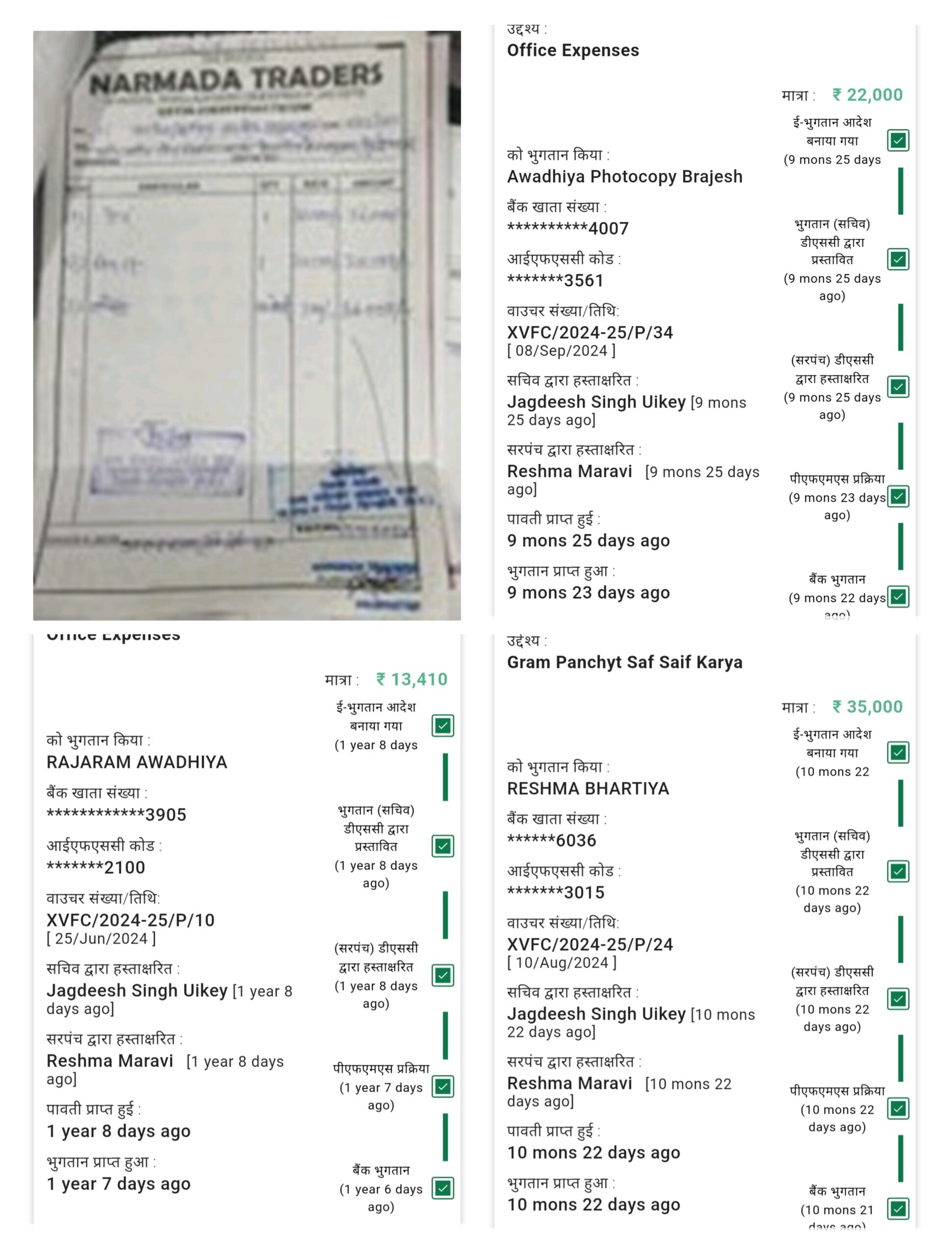जानकारी के अनुसार वर्ष 2025 जनवरी से जून तक मात्र 6 माह में अवधिया फोटोकॉपी स्टेशनरी के नाम पर हर माह लगातार हजारों रुपए का भुगतान किया गया है। पांचवें वित्त योजना के तहत जून में 15000,3681,7500,3538,8130,6786,11380,5245,11000,14840, और 15वें वित्त मद से मार्च में 15000, मजदूरी के नाम पर 3000,4200,4165,22000, हजार रुपए भुगतान किया गया है। यह तो सिर्फ अवधिया फोटोकॉपी स्टेशनरी के नाम पर फर्जीवाड़ा किया गया है , स्टेशनरी संचालक को मजदूरी के नाम पर भी 3000हजार भुगतान किया गया है। इतना ही नहीं अन्य व्यय, साफ सफाई, ओर मरम्मत के नाम पर बगैर सक्षम स्वीकृति के लाखों रुपए उड़ाए गए हैं।