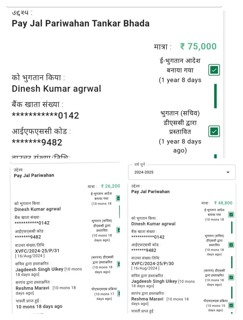 प्राप्त जानकारी के अनुसार वर्ष 2024- 25 में ग्राम पंचायत द्वारा पेयजल परिवहन के नाम पर लगभग 3,50,000 हजार रुपए से अधिक राशि का भुगतान कर 15 वें वित्त का दुरुपयोग किया गया है।