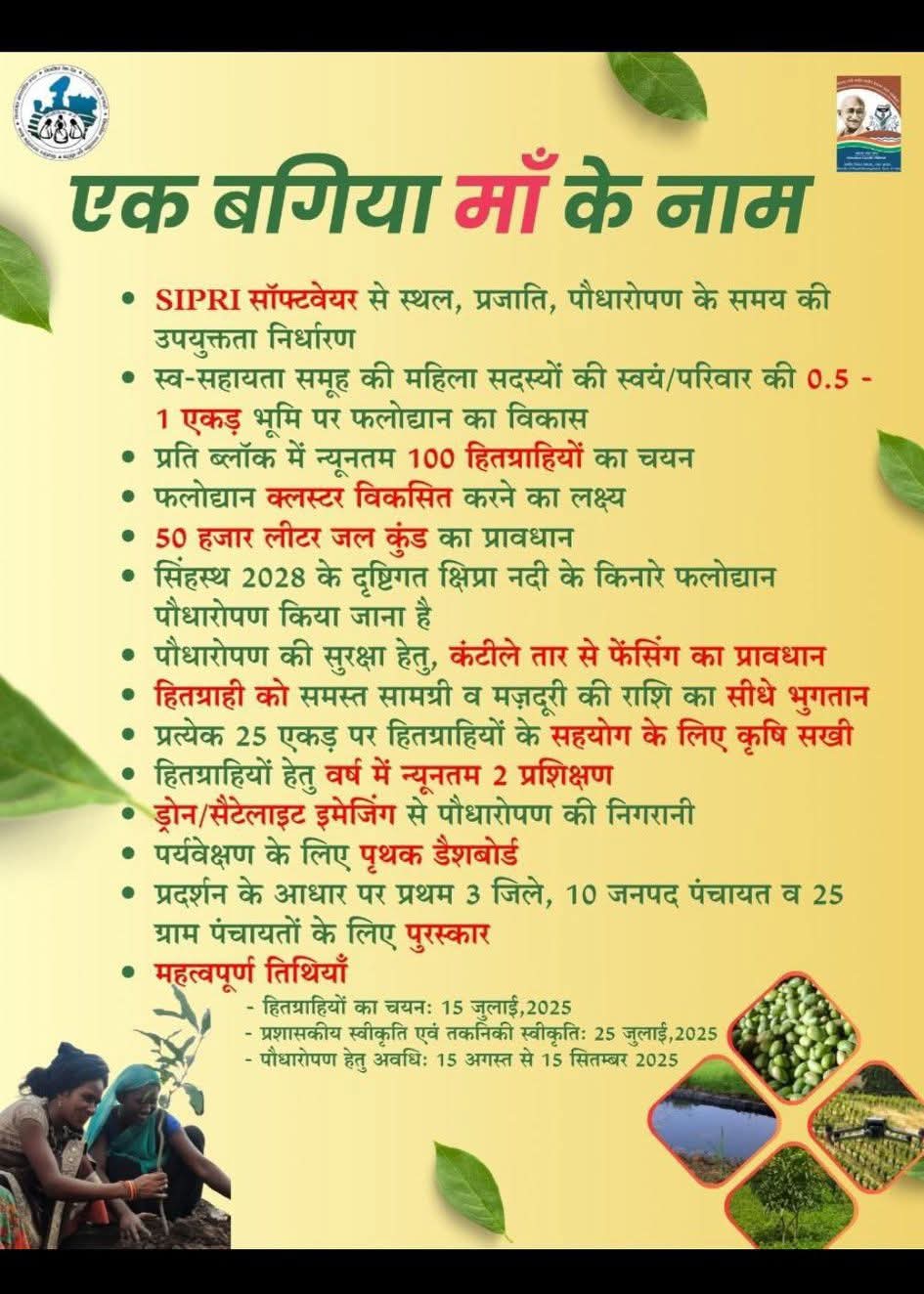 डिंडौरी न्यूज़। एक पेड़ मां के नाम अभियान 2.0 को पूरे देश में राष्ट्रव्यापी आंदोलन के रूप में चलाया जा रहा है।उसी क्रम में महात्मा गांधी नरेगा से स्व सहायता समूह में सक्रिय भागीदारी निभाने वाली महिला सदस्यों को फल उद्यान उपयोजना से लाभान्वित करने के विस्तृत दिशा निर्देश पंचायत एवम ग्रामीण विकास विभाग द्वारा जारी किए गए हैं।एक बगिया मां के नाम उपयोजना के तहत एसएचजी की इच्छुक महिला जिसके पास आधा एकड़ से एक एकड़ जमीन है वो योजना का लाभ ले सकेंगी।