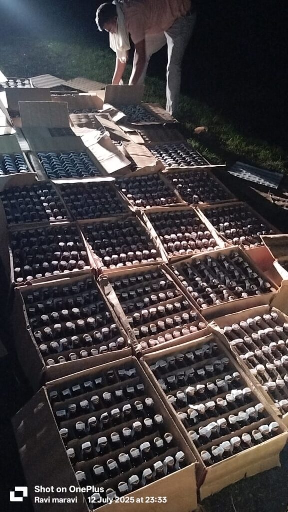 पुलिस टीम द्वारा ग्राम खड़देवरी, भीखमपुर तिराहा (निवास-जबलपुर मार्ग) पर घेराबंदी कर संदिग्ध वाहन को रोककर वाहन की तलाशी ली गई, जिसमें कुल 39 पेटी अंग्रेजी शराब बरामद की गई। इसमें 15 पेटी एम.डी. रम थीं, जिनमें कुल 129.6 लीटर शराब पाई गई। वहीं 24 पेटी जिनियस ट्रिपल एक्स रम से 216 लीटर शराब मिली। कुल बरामद शराब की मात्रा 345.6 लीटर रही, जिसकी अनुमानित कीमत ₹2,77,200/- है।
