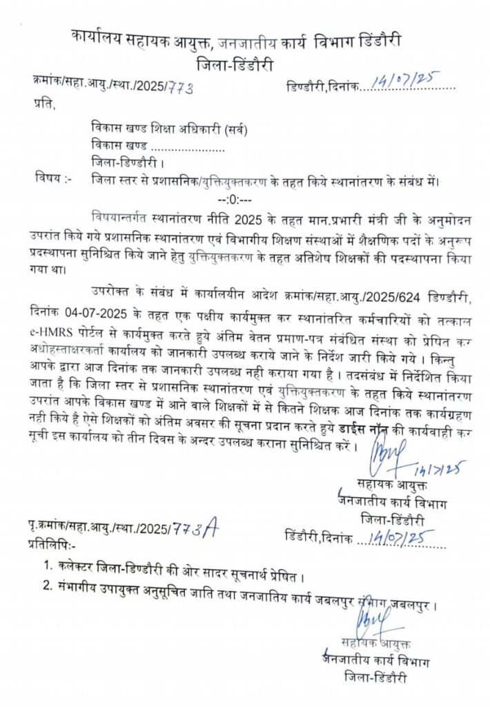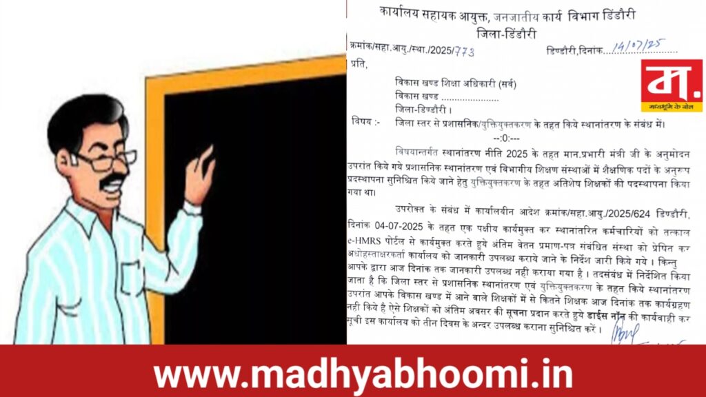 डिंडौरी न्यूज़ । जिले में जिला स्तरीय प्रशासनिक/सुगमिकीकरण नीति के अंतर्गत किए गए स्थानांतरण के बावजूद नवीन शाला में कार्यभार ग्रहण न करने वाले शिक्षकों पर कार्रवाई के संकेत दिए गए हैं। इस संबंध में सहायक आयुक्त, जनजातीय कार्य विभाग, डिंडौरी द्वारा समस्त विकासखंड शिक्षा अधिकारियों को निर्देश जारी किए गए हैं।
