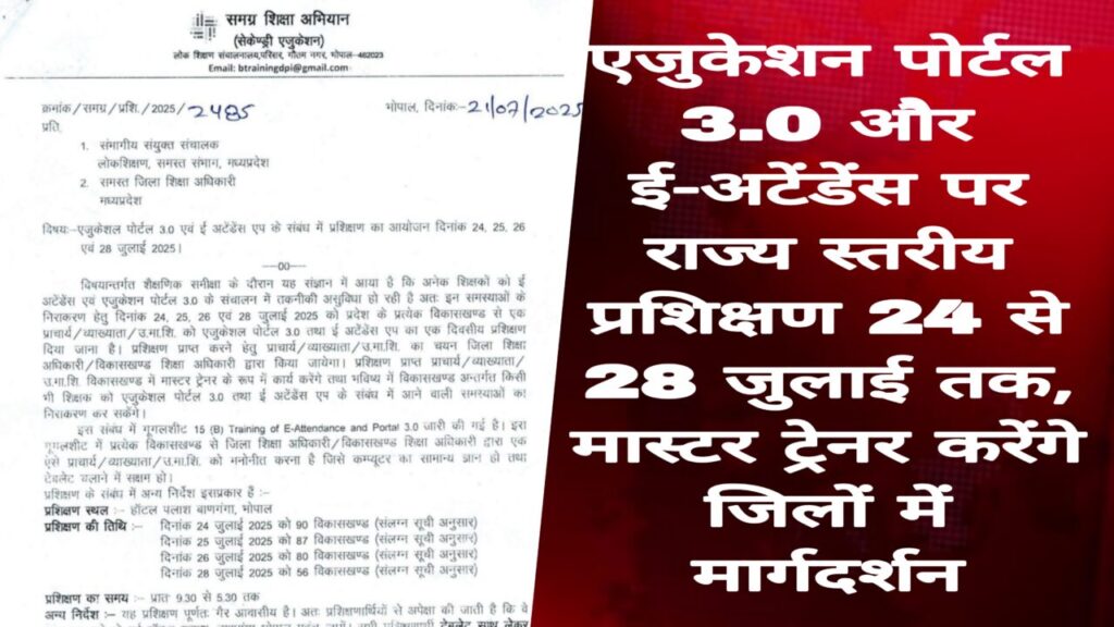 भोपाल न्यूज़। मध्यप्रदेश में शिक्षा व्यवस्था को और अधिक पारदर्शी और सुदृढ़ बनाने के उद्देश्य से लोक शिक्षण संचालनालय, समग्र शिक्षा अभियान द्वारा एजुकेशन पोर्टल 3.0 और ई-अटेंडेंस के संबंध में राज्य स्तरीय विशेष प्रशिक्षण का आयोजन किया जा रहा है। यह प्रशिक्षण 24, 25, 26 और 28 जुलाई 2025 को भोपाल स्थित होटल पलाश रेजीडेंसी में होगा।