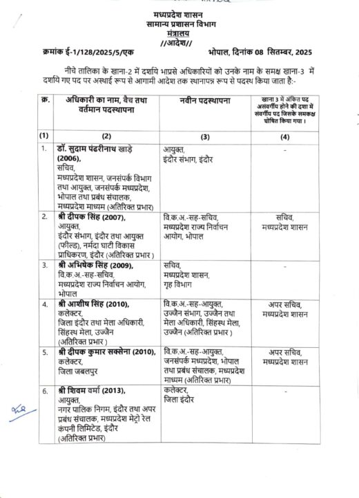 जबलपुर, कटनी, बड़वानी, आगर मालवा और इंदौर में युवा अधिकारियों को कलेक्टर बनाया गया है। सरकार की प्रशासनिक सर्जरी को कसावट की दृष्टि से बड़ा कदम और नौकर शाही की नई जमावट के तौर पर देखा जा रहा है।