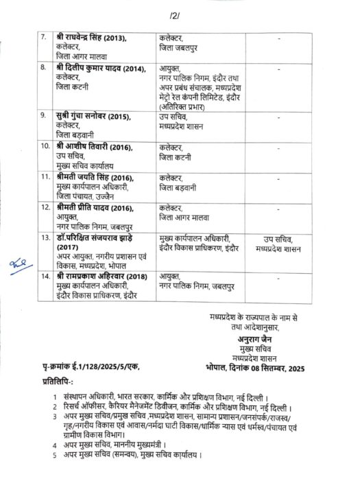 मध्यप्रदेश की मोहन सरकार ने देर रात प्रशासनिक कसावट को ध्यान में रखते हुए 14 IAS अधिकारियों सहित पांच जिलों के कलेक्टरो के तबादला आदेश जारी किए गए ।