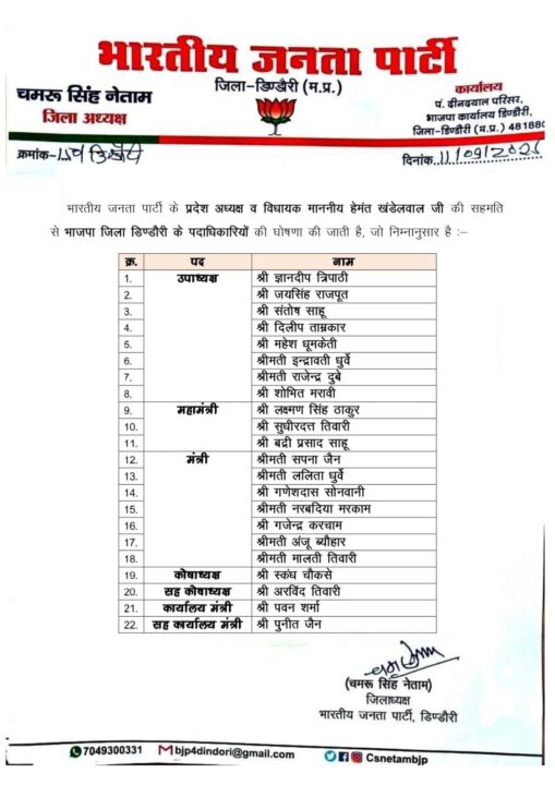 डिंडौरी। भारतीय जनता पार्टी के प्रदेश विधायक हेमंत खंडेलवाल की सहमति से भाजपा जिला डिंडौरी के पदाधिकारियों की घोषणा कर दी गई है। जिला अध्यक्ष चमरू सिंह नेताम द्वारा जारी सूची में उपाध्यक्ष, महामंत्री, मंत्री, कोषाध्यक्ष एवं अन्य पदों के लिए कार्यकर्ताओं की नियुक्ति की गई है।