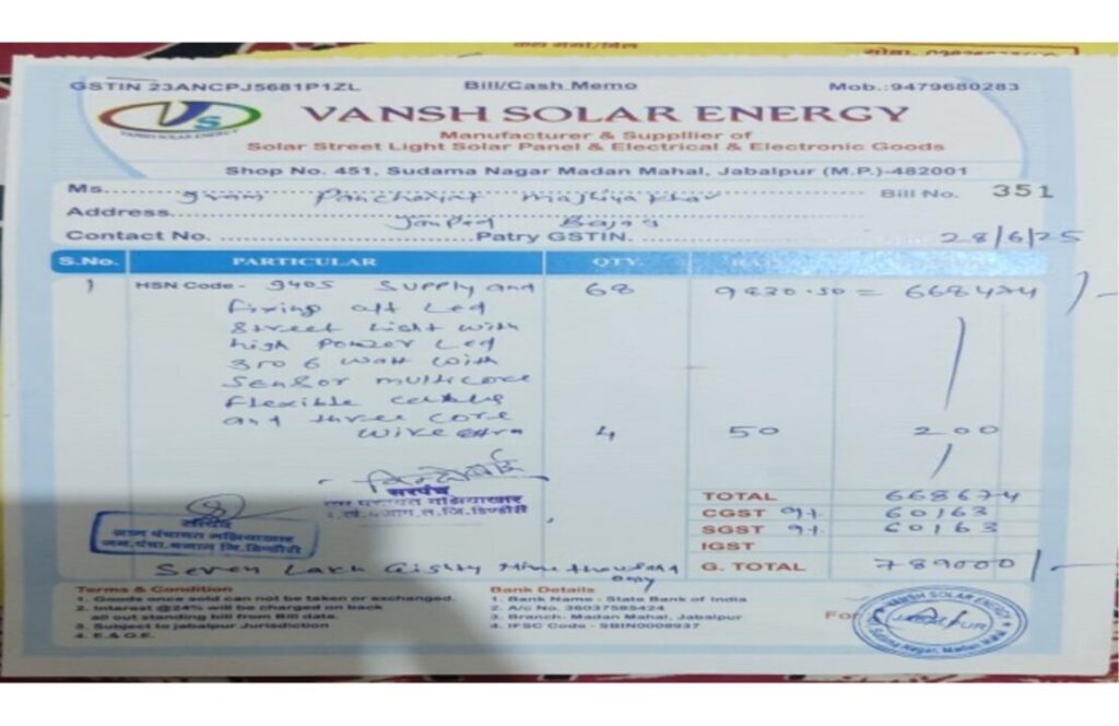 ग्राम पंचायत मझियाखार के सरपंच सचिव और ठेकेदार ने मिलकर शासन के निर्णय और आदेशों को ठेंगा दिखाते हुए गांव में सोलर लाईट लगाया लेकिन ग्राम पंचायत द्वारा भुगतान किए गए बिल में एलईडी खरीदी नाम पर वंश सोलर एनर्जी को 789000 रु का भुगतान 28/06/2025 को किया है। जबकि गांव में एलईडी की बजाय सिर्फ 30 नग प्रतिबंधित सोलर लाईट लगाए गए हैं।
