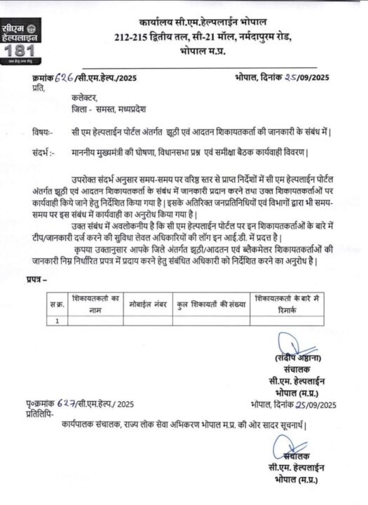 भोपाल। सीएम हेल्पलाइन भोपाल ने प्रदेश के सभी कलेक्टरों को पत्र जारी कर फर्जी और आदतन शिकायतकर्ताओं की विस्तृत जानकारी उपलब्ध कराने के निर्देश दिए हैं।