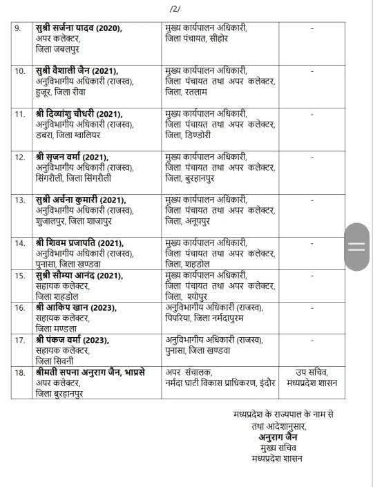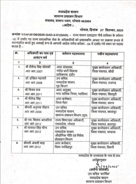 भोपाल। मध्यप्रदेश शासन के सामान्य प्रशासन विभाग द्वारा भारतीय प्रशासनिक सेवा (IAS) अधिकारियों के तबादले किए गए हैं। जारी आदेश के अनुसार कुल 18 IAS अधिकारियों के पदस्थापना स्थल बदले गए हैं।