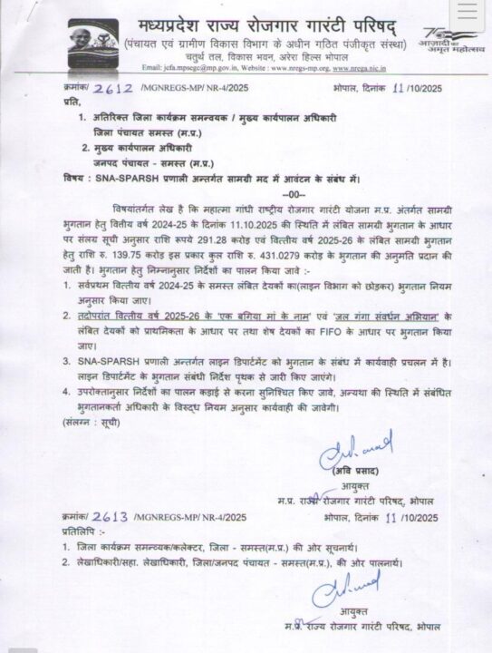 MP News, भोपाल। महात्मा गांधी राष्ट्रीय ग्रामीण रोजगार गारंटी योजना (मनरेगा) के अंतर्गत मजदूरों और सामग्री आपूर्तिकर्ताओं को समय पर भुगतान सुनिश्चित करने के उद्देश्य से मध्यप्रदेश राज्य रोजगार गारंटी परिषद द्वारा निर्णय लिया गया है। परिषद ने कुल 431.02 करोड़ रुपये की राशि स्वीकृत कर जारी की है। यह जानकारी आयुक्त अवि प्रसाद द्वारा जारी आदेश क्रमांक 2612/MGNREGS-MP/NR-4/2025 में दी गई है।