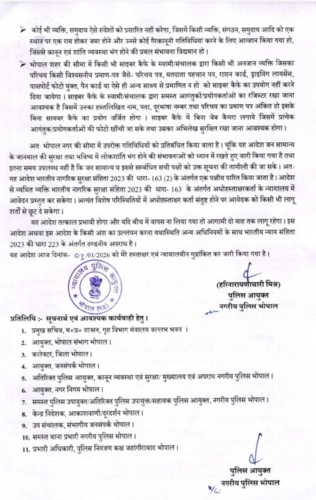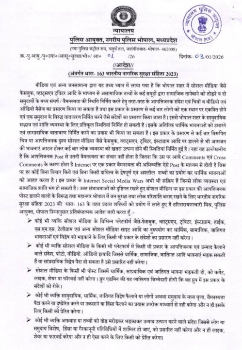 भोपाल। शहर में सोशल मीडिया के माध्यम से फैल रही अफवाहों, आपत्तिजनक पोस्ट, भड़काऊ टिप्पणियों एवं साम्प्रदायिक सौहार्द बिगाड़ने वाली गतिविधियों पर नियंत्रण लगाने के उद्देश्य से भोपाल पुलिस आयुक्त द्वारा भारतीय नागरिक सुरक्षा संहिता 2023 की धारा 163 के अंतर्गत कड़े प्रतिबंधात्मक आदेश जारी किए गए हैं। यह आदेश 3 जनवरी 2026 से तत्काल प्रभावशील हो गया है और आगामी दो माह तक लागू रहेगा।