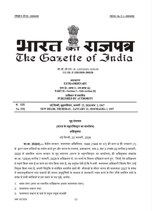 नई दिल्ली। भारत सरकार ने वर्ष 2027 में प्रस्तावित राष्ट्रीय जनगणना की औपचारिक शुरुआत कर दी है। इसके तहत जनगणना के प्रथम चरण – मकानसूचीकरण एवं मकानों की गणना के लिए विस्तृत प्रश्नावली जारी कर दी गई है। यह अधिसूचना भारत का राजपत्र (द गजट ऑफ इंडिया), असाधारण में प्रकाशित की गई है, जिसे जनगणना 2027 की तैयारियों का महत्वपूर्ण कदम माना जा रहा है।