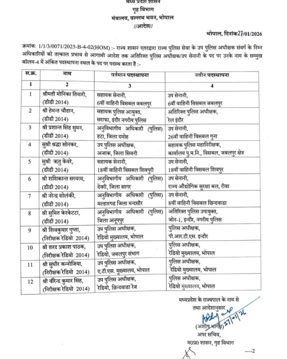 भोपाल। मध्यप्रदेश शासन के गृह विभाग ने राज्य पुलिस सेवा के अधिकारियों के प्रशासनिक फेरबदल के आदेश जारी किए हैं। जारी आदेश के अनुसार वर्ष 2014 बैच के राज्य पुलिस सेवा अधिकारियों सहित रेडियो संवर्ग के अधिकारियों को तत्काल प्रभाव से आगामी आदेश तक अतिरिक्त पुलिस अधीक्षक/उप सेनानी के पद पर पदस्थ किया गया है। यह आदेश 27 जनवरी 2026 को मंत्रालय, वल्लभ भवन, भोपाल से जारी किया गया।