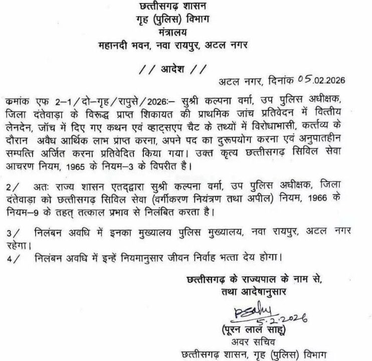 रायपुर । छत्तीसगढ़ शासन के गृह (पुलिस) विभाग ने दंतेवाड़ा जिले की उप पुलिस अधीक्षक (DSP) सुश्री कल्पना वर्मा को तत्काल प्रभाव से निलंबित कर दिया है। कार्रवाई उनके विरुद्ध प्राप्त शिकायत की प्राथमिक जांच रिपोर्ट के आधार पर की गई है, जिसमें कारोबारी के साथ कथित प्रेम-प्रसंग, उससे जुड़े वित्तीय लेनदेन, जांच के दौरान दिए गए कथनों और व्हाट्सएप चैट के तथ्यों में विरोधाभास, पद के दुरुपयोग तथा अनुपातहीन संपत्ति अर्जित करने जैसे गंभीर आरोप सामने आए हैं।