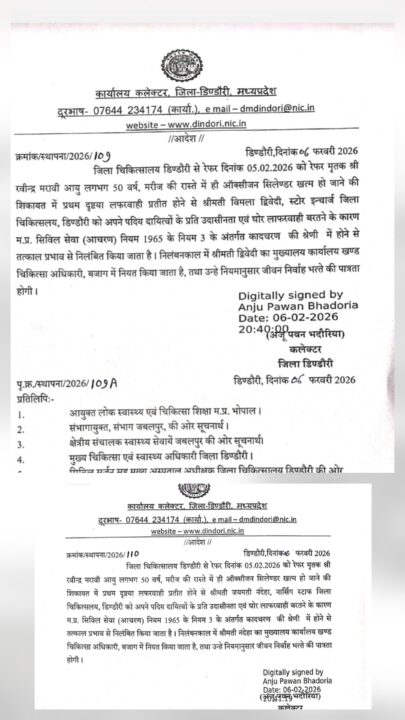 जिला चिकित्सालय डिंडौरी से 5 फरवरी 2026 को प्राप्त रिफरेंस के अनुसार, लगभग 50 वर्षीय मरीज रविंद्र मरावी को एंबुलेंस से उपचार हेतु जबलपुर रैफर किया गया लेकिन जबलपुर जाते समय आधे रास्ते में ऑक्सीजन सिलेंडर खत्म हो जाने से मरीज की मौत हो गई, कल परिजनों द्वारा जिम्मेदारों के विरुद्ध कार्रवाई की मांग को लेकर जिला चिकित्सालय के सामने चकाजाम कर विरोध प्रदर्शन किया था । प्रशासन द्वारा अमानवीय लापरवाही मामलें की जांच में पाया गया कि नर्सिंग स्टाफ द्वारा अपने पदीय दायित्वों के प्रति गंभीर उदासीनता और घोर लापरवाही बरती गई।