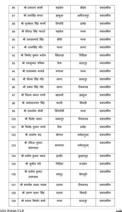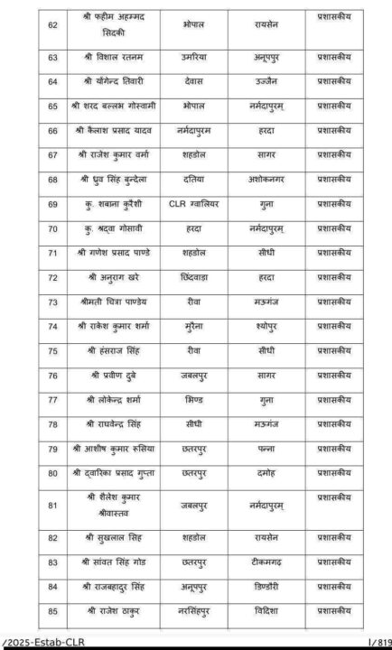 इस व्यापक फेरबदल के तहत इंदौर, भोपाल, जबलपुर, ग्वालियर, रीवा, सागर, छतरपुर, पन्ना, डिंडोरी, विदिशा, सीधी, शहडोल, बालाघाट, नीमच, उज्जैन, राजगढ़, अशोकनगर, टीकमगढ़, दमोह, शिवपुरी, मुरैना, अनूपपुर सहित अनेक जिलों में पदस्थ राजस्व निरीक्षकों का स्थानांतरण किया गया है। कई अधिकारियों को एक संभाग से दूसरे संभाग में भेजा गया है, जिससे प्रशासनिक कार्यों में नई ऊर्जा और पारदर्शिता लाने का प्रयास माना जा रहा है। आदेश में सभी अधिकारियों को निर्देशित किया गया है कि वे तत्काल प्रभाव से नवीन पदस्थापना स्थल पर कार्यभार ग्रहण कर इसकी सूचना विभाग को उपलब्ध कराएं।