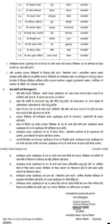 भोपाल न्यूज । मध्यप्रदेश शासन के राजस्व विभाग द्वारा प्रदेशभर में बड़ा प्रशासनिक फेरबदल करते हुए 119 राजस्व निरीक्षकों को प्रभारी नायब तहसीलदार के रूप में पदस्थ किया गया है। यह आदेश मंत्रालय, वल्लभ भवन भोपाल से जारी किया गया है, जो तत्काल प्रभाव से आगामी आदेश तक लागू रहेगा।