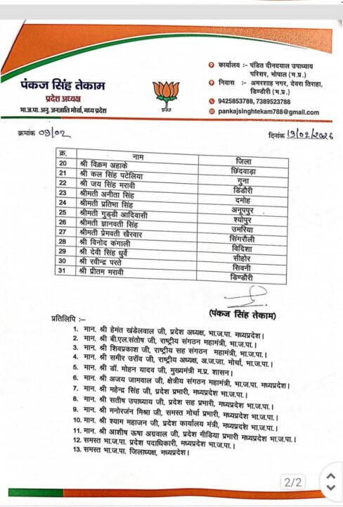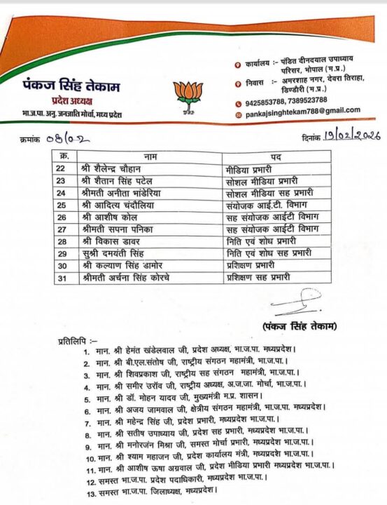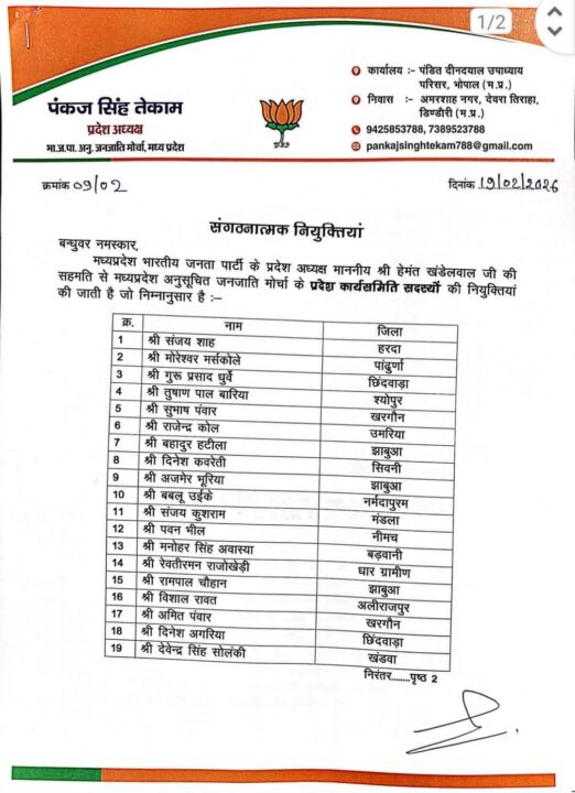 भोपाल। भारतीय जनता पार्टी के अनुसूचित जनजाति मोर्चा, मध्यप्रदेश के प्रदेश अध्यक्ष पंकज सिंह तेकाम ने नई प्रदेश कार्यकारिणी की घोषणा करते हुए संगठनात्मक नियुक्तियों के आदेश जारी कर दिए हैं। यह नियुक्तियां भाजपा मध्यप्रदेश के प्रदेश अध्यक्ष हेमंत खंडेलवाल की सहमति से की गई हैं।