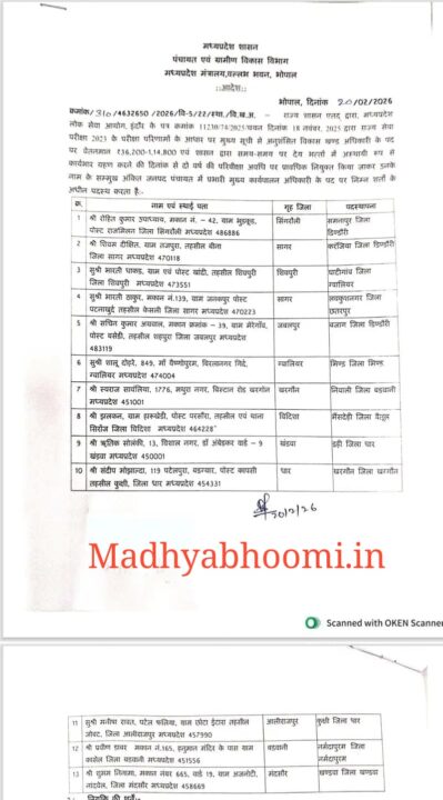 भोपाल। मध्यप्रदेश शासन, पंचायत एवं ग्रामीण विकास विभाग मंत्रालय,द्वारा राज्य सेवा परीक्षा 2023 के परिणामों के आधार पर मुख्य सूची से अनुशंसित 13 विकास खण्ड अधिकारियों को प्रावधिक नियुक्ति देते हुए विभिन्न जनपद पंचायतों में प्रभारी मुख्य कार्यपालन अधिकारी के पद पर पदस्थ किया गया है।