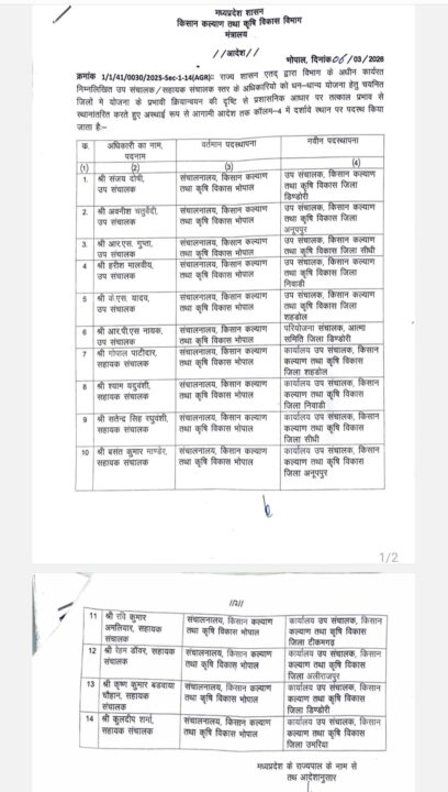 भोपाल न्यूज । मध्यप्रदेश शासन के किसान कल्याण तथा कृषि विकास विभाग ने धन-धान्य योजना के प्रभावी क्रियान्वयन को ध्यान में रखते हुए विभाग में बड़ा प्रशासनिक फेरबदल किया है। मंत्रालय, भोपाल से जारी आदेश के तहत उप संचालक और सहायक संचालक स्तर के 14 अधिकारियों का तत्काल प्रभाव से स्थानांतरण कर उन्हें विभिन्न जिलों में अस्थायी रूप से आगामी आदेश तक पदस्थ किया गया है।
