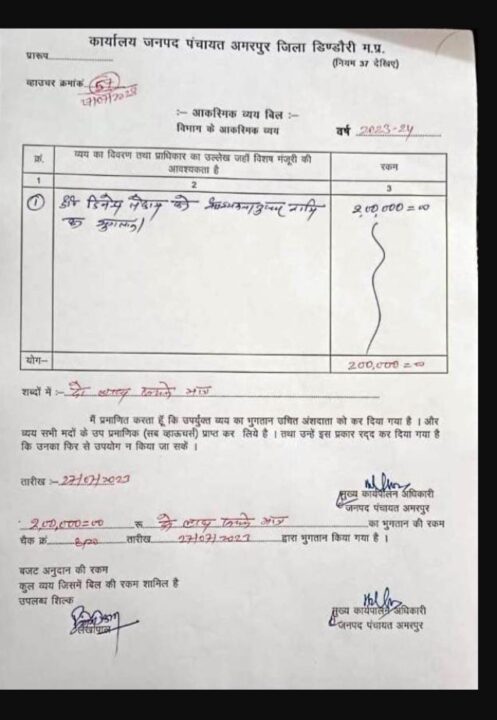 भले ही जनपद पंचायत से ग्रामीण विकास और ग्राम पंचायतों के वाशिंदों के बुनियादी विकास का रोड मैप तैयार किया जाता हो लेकिन अमरपुर जनपद पंचायत में बाबू और अधिकारियों ने ही शासन की मंशा को मटियामेट कर दिया, अधिकारियों ने आम जनता के बुनियादी सुविधाओं के लिए नहीं बल्कि बाबू दिनेश कुमार तेकाम के बच्चे का चौक कार्यक्रम के नाम पर ही जनपद पंचायत के खाते से दिनांक 16/04/2024 को बाबू के खाते में 75000 हजार रुपए का भुगतान कर दिया है। हमारे पास मौजूद दस्तावेजों के अनुसार बाबू दिनेश कुमार तेकाम को चौक कार्यक्रम, चाय नाश्ता, टेंट, सहित अन्य कार्यों के नाम पर 40 लाख रुपए का भुगतान किया गया है। जिला पंचायत द्वारा कराए गए जांच में प्रथम दृष्टया 40 लाख रुपए की हेराफेरी उजागर हुई है, फिलहाल कार्रवाई ठंडे बस्ते में है..?