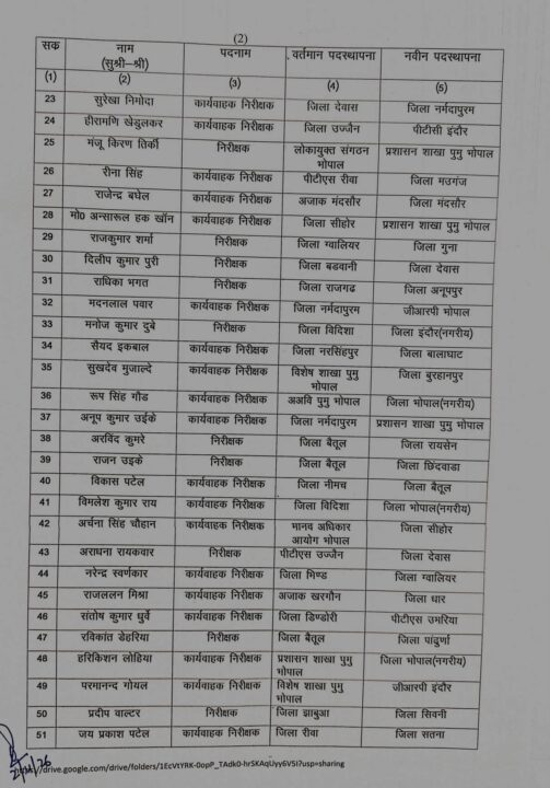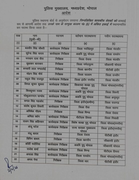 सूची में शामिल अधिकारियों में बलवीर सिंह चौधरी को नर्सिंहपुर से मंदसौर, सुरेंद्र सिंह यादव को भोपाल से रायसेन, भगवान दास वीरा को देवास से मंदसौर, सुधाकर बारस्कर को नर्मदापुरम से जीआरपी भोपाल, बनवारी लाल मंडलोई को खरगोन से पीटीसी इंदौर तथा राहुल सिंह राजपूत को इंदौर से मंदसौर स्थानांतरित किया गया है।