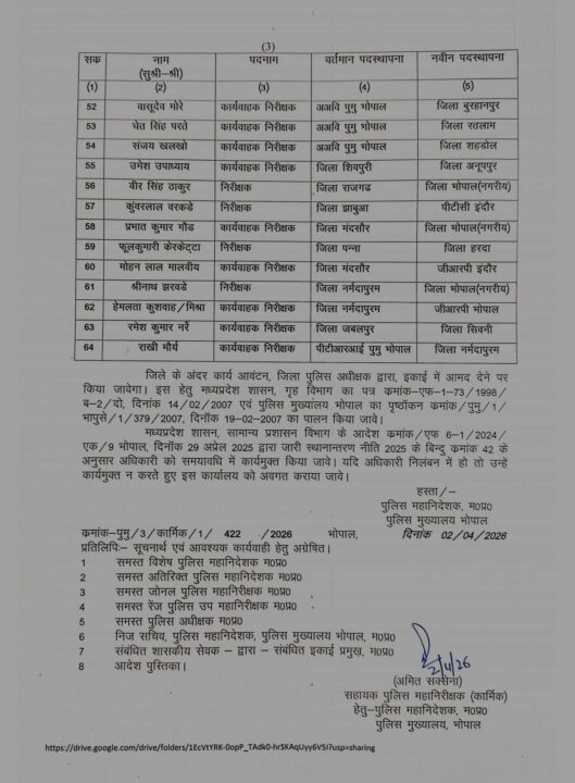 भोपाल । मध्यप्रदेश पुलिस मुख्यालय, भोपाल द्वारा बड़े प्रशासनिक फेरबदल के तहत राज्यभर में निरीक्षक एवं कार्यवाहक निरीक्षक स्तर के कुल 64 अधिकारियों के तबादले किए गए हैं। इस संबंध में जारी आदेश के अनुसार सभी अधिकारियों को आगामी आदेश तक नवीन पदस्थापना स्थल पर तत्काल प्रभाव से कार्यभार ग्रहण करने के निर्देश दिए गए हैं।