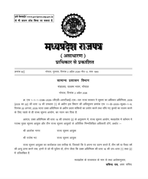 भोपाल। मध्यप्रदेश राज्य सूचना आयोग में लंबे समय से रिक्त पड़े पदों को भरते हुए राज्य सरकार ने अहम कदम उठाया है। राजेश भट्ट और आलोक नागर को राज्य सूचना आयुक्त नियुक्त किया गया है। इस संबंध में सामान्य प्रशासन विभाग द्वारा राजपत्र में अधिसूचना जारी कर दी गई है।