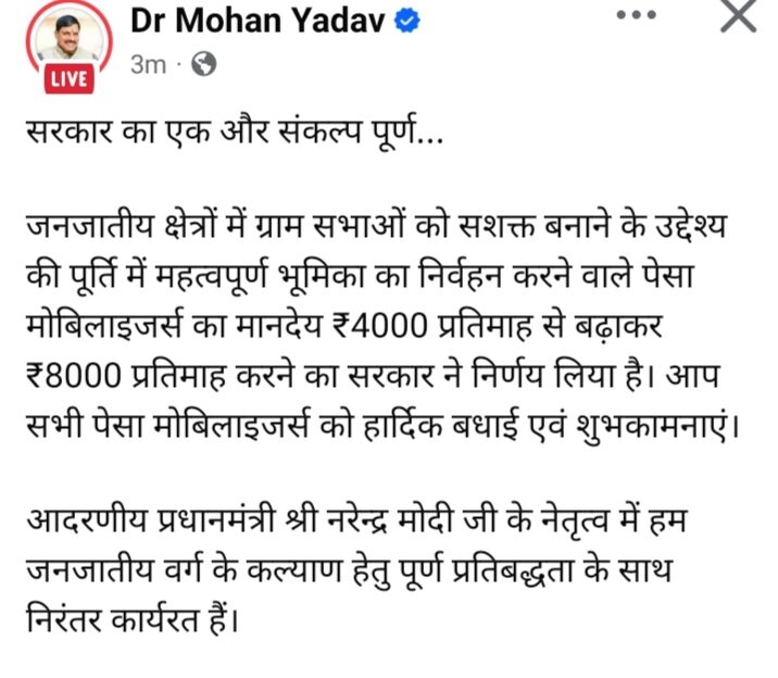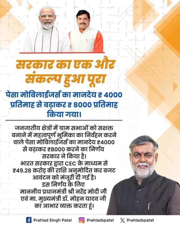 मध्यप्रदेश सरकार द्वारा पेसा एक्ट को धरातल में मजबूती के साथ लागू करने के लिए सूबे के 20 जिलों एवं अनुसूचित 89 ब्लॉकों में जिला से लेकर ग्राम स्तर पर पेसा मोबलाईजरो की भर्ती की गई थी, मध्यप्रदेश में लगभग 5254 से अधिक पैसा कर्मी आर्थिक तंगी से जूझ रहे हैं। सरकार के वादे और दावे महज घोषणा तक सीमित है, मुख्यमंत्री मोहन यादव और पंचायत मंत्री प्रहलाद सिंह पटेल ने पेसा मोबलाईजरो का वेतन 4हजार से बढ़ाकर 8 हजार करने का वादा किया था लेकिन 8 हजार तो दूर मूल रूप से मिलने वाली 4000 हजार रुपए मानदेय भी कई महीनों से नहीं मिल रहा है।
