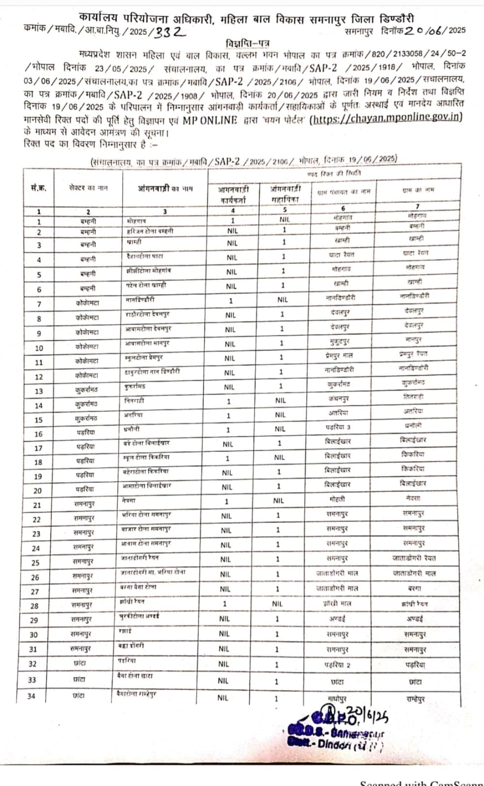 समनापुर विकास खंड अंतर्गत 53 आंगनबाड़ी केंद्रों में कार्यकर्ता/सहायिका पदों की विज्ञप्ति जारी