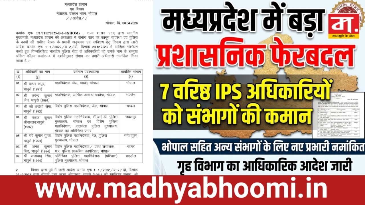 मध्यप्रदेश में बड़ा प्रशासनिक फेरबदल: 7 वरिष्ठ IPS अधिकारियों को संभागों की कमान