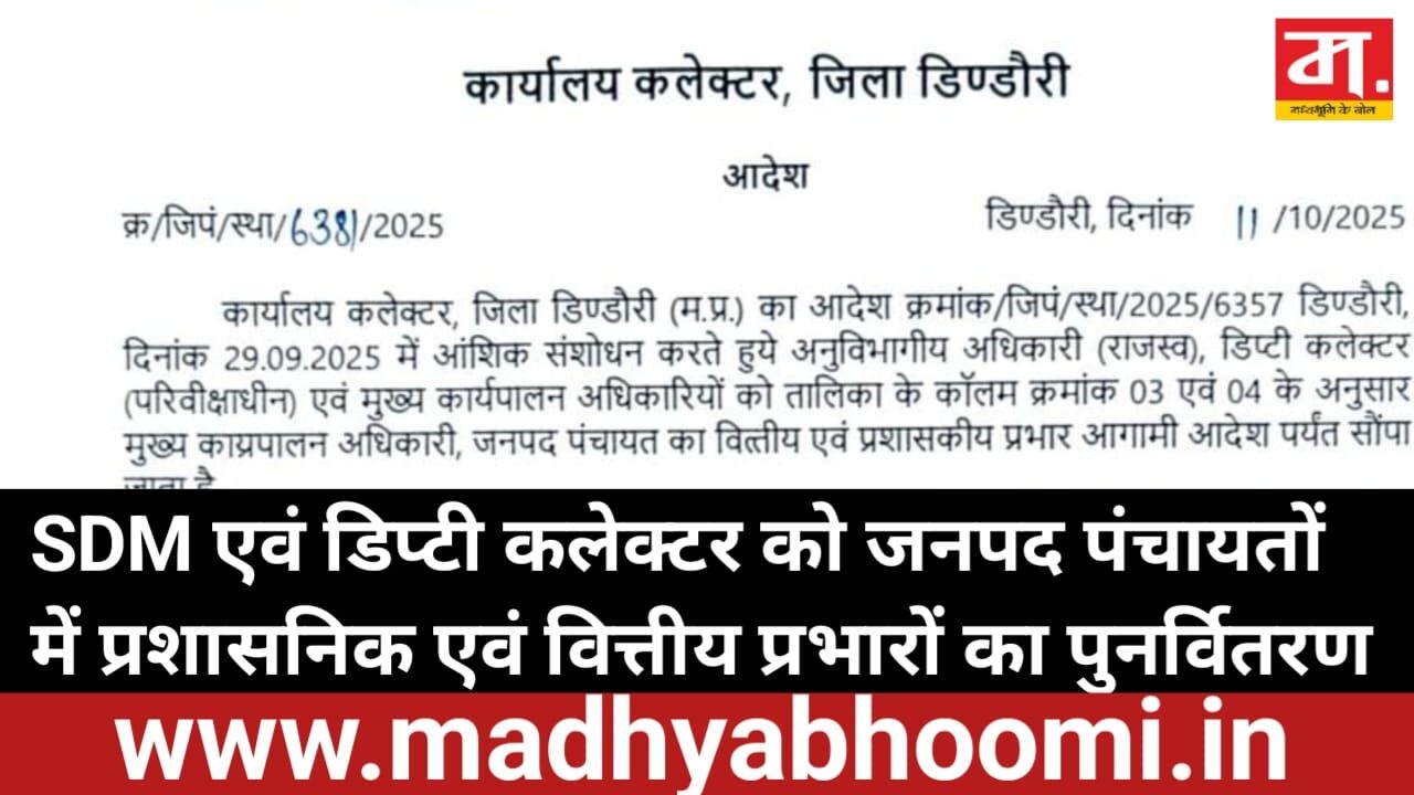 Dindori News: SDM एवं डिप्टी कलेक्टर को जनपद पंचायतों में प्रशासनिक एवं वित्तीय प्रभारों का पुनर्वितरण,कलेक्टर ने जारी किया आदेश